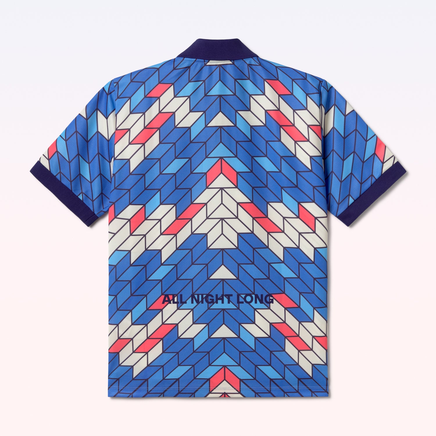 Short-sleeve polo shirt featuring a bold geometric all-over print with a contrasting navy collar and sleeve cuffs.